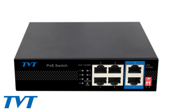 Unmanaged PoE switch with 4x 100Mbps POE ports and 2x 100Mbps uplink ports. Port 1-4 can support IEEE 802.3 af/at PoE standard, single-port PoE power up to 30W, built-in power supply
