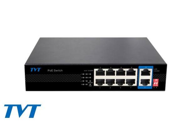Unmanaged PoE switch with 8x 100Mbps POE ports and 2x 1000Mbps uplink ports. Port 1-8 can support PoE+ standard, single-port PoE power up to 30W, built-in power supply